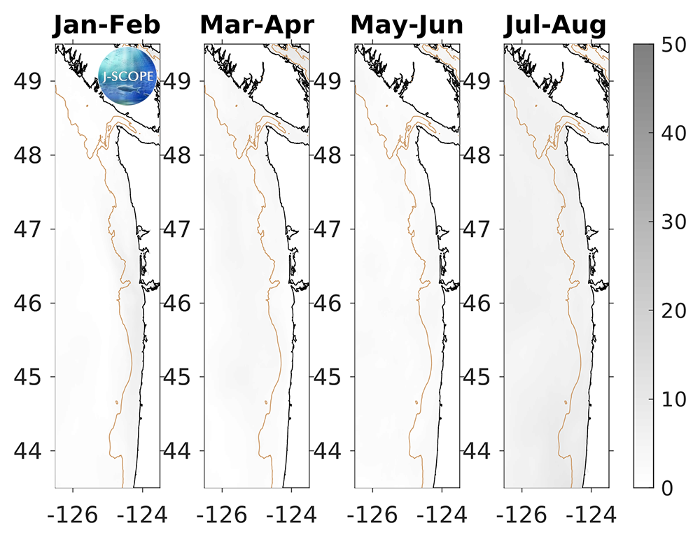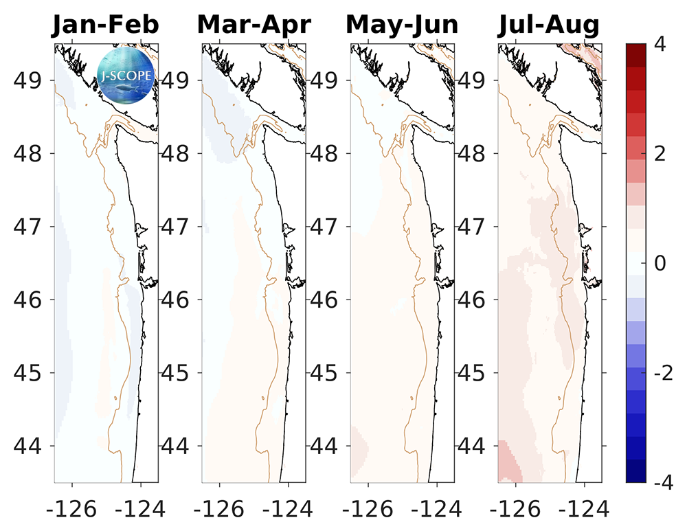 For waters off the Washington and Oregon coast, the forecast projects that SST will be near climatological throughout the forecast, including the upwelling season. The relative uncertainty is very low (<10%) for the entire forecast.