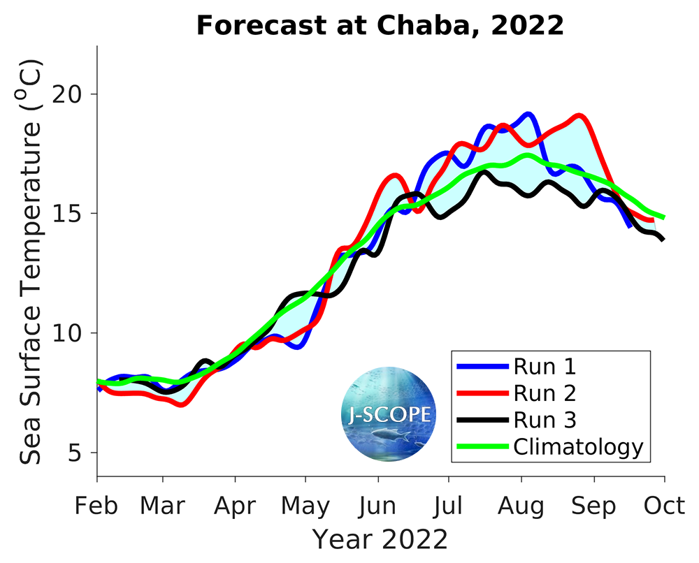The SST was forecast using all three model runs of the ensemble for three point locations where buoys exist, Ćháʔba· off La Push, Washington, NH-10 off Newport, Oregon, and CE042 in the Olympic Coast National Marine Sanctuary, are shown below. All three indicate near climatological SSTs during the summer upwelling season.