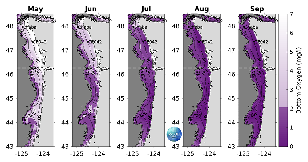 The modeled region bottom oxygen (mg/l) averaged over all three ensemble members and in time for (from left to right) May, June, July, August, and September. Hypoxia (O2 < 2 mg/l) is shown in dark purple, land is shown in light grey, and offshore areas are shaded dark gray. The black dashed line indicates the boundary between Washington and Oregon waters. Black contours indicate bathymetry on the shelf. Two mooring locations are plotted for reference (Ćháʔba·, CE042).