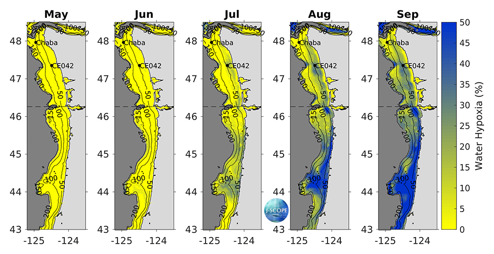 The modeled region water column hypoxia (%) averaged over all three ensemble members and in time for (from left to right) May, June, July, August, and September. Land is shown in light grey, and offshore areas are shaded dark gray. The black dashed line indicates the boundary between Washington and Oregon waters. Black contours indicate bathymetry on the shelf. Two mooring locations are plotted for reference (Ćháʔba·, CE042).