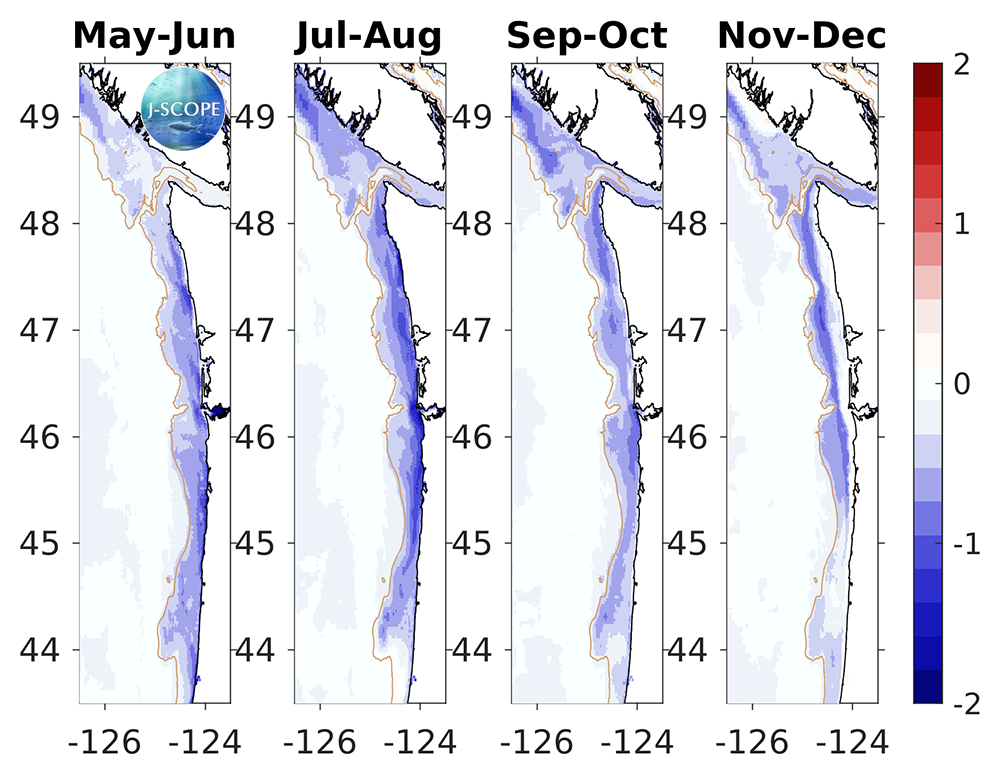 Forecasted bottom oxygen (mg/l), averaged over three ensemble members for each month, indicates declines in oxygen concentrations over the course of the forecast for both Washington and Oregon, with hypoxia (O2 < 2 mg/l) prominent over much of the Oregon shelf in June and expanding to much of the Washington shelf in July and continuing through September eventually overtaking the typically normoxic region at the northern boundary of the Washington shelf around Ćháʔba·.