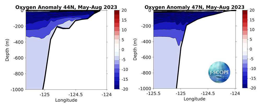 Finally, climatological cross-sections from the Newport Line in Oregon (44°N) and the Grays Harbor Line in Washington (47°N) are compared to the forecasted average of the ensemble members during the summer upwelling season (May-August). In both Oregon and Washington, the forecast projects that the oxygen concentration for the upwelling season of 2023 will be lower than the climatology on both the shelf and at deeper depths, with the largest anomalies occurring between the surface and ~350 m depth in Oregon, and 500 m depth in Washington. Notably, the Oregon cross-section outer shelf is forecasted to be near climatological at the bottom.