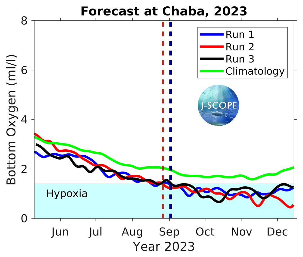 Time series of bottom oxygen from the Washington coast near one of the Olympic Coast National Marine Sanctuary (OCNMS) moorings at Cape Elizabeth (site CE042), from NH-10 mooring off of Newport, Oregon, and from the Ćháʔba· mooring off of La Push, Washington, are shown for each member of the ensemble. The model forecasts that hypoxia will most likely develop at all three moorings - but more likely at the NH-10 and CE042 moorings in early-mid June, which is about one month before the climatological onset of hypoxia (green). Another time series from the outer Washington shelf, Ćháʔba·, forecasts hypoxia onset in September is unusual for this location and there is not typically hypoxia observed at this location.