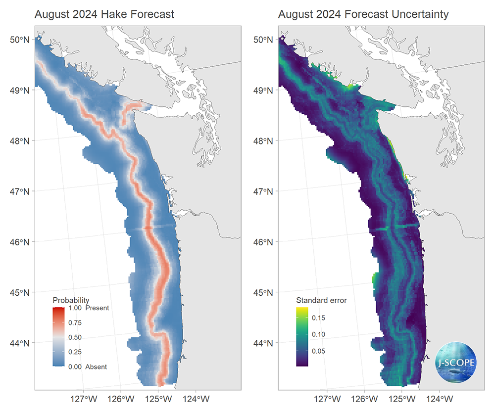 Right panel: Uncertainty associated with the Pacific hake forecast for August 2024. Forecast uncertainty is higher in locations with brighter colors (yellow) and lower for darker locations (dark blue). Uncertainty tended to be highest in areas just inshore and just offshore of the 200 meter shelf break.