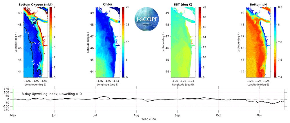 The movie above shows the J-SCOPE forecast for 2024, from ensemble model run 3 initialized on April 26. More information about the three panels on the left can be found by navigating the Oxygen, Chlorophyll, and Sea Surface Temperature tabs above. The panel on the far right depicts the evolution of bottom water pH over the forecast period. The 8-day upwelling index is calculated using the method described in Austin and Barth (2002) and can also be found under the California Current Indicators tab above.