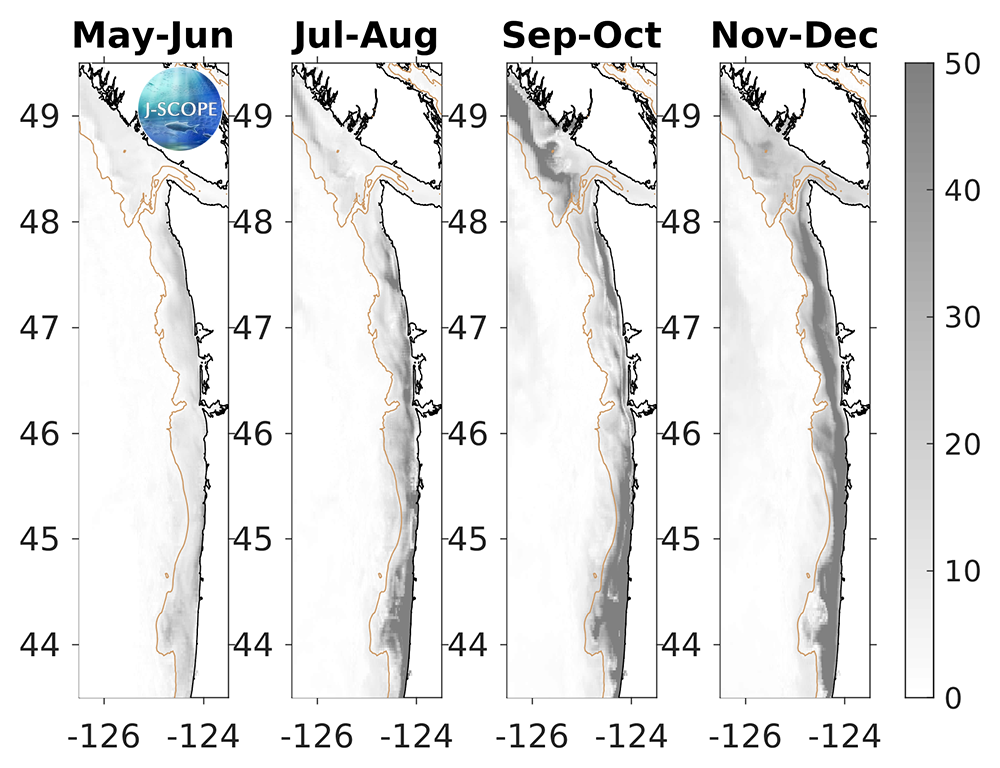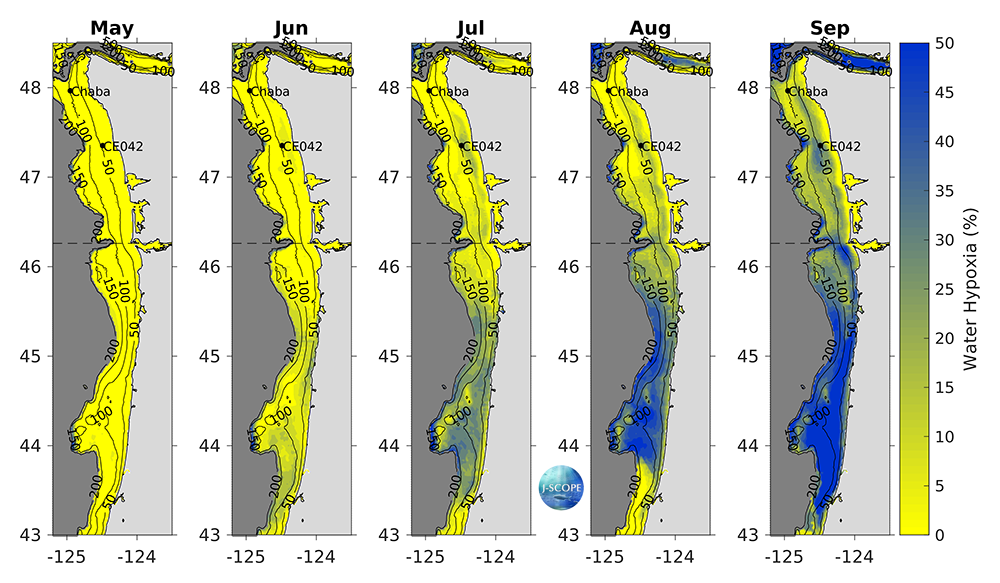 Hypoxia extends upward into the water column as well. The percentage of the water column that is forecasted to experience hypoxia (O2 < 2 mg/l) is a metric for this phenomenon. Early in the upwelling season, hypoxia is forecasted to occupy a small percentage of the water column over the entire modeled region (<10%). In July, some regions in Oregon, begin to experience more than ~20%. Over the course of the summer, the percentage of the water column that is hypoxic increases mostly in Oregon, with particularly high volumes forecasted for Heceta Bank on the Oregon shelf and south of Cape Elizabeth in August and September with values exceeding 50% of the water column experiencing hypoxia.