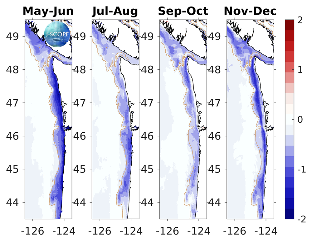 Forecasted bottom oxygen (mg/l), averaged over three ensemble members for each month, indicates declines in oxygen concentrations over the course of the forecast for both Washington and Oregon, with hypoxia (O2 < 2 mg/l) prominent over about the outer shelf of Oregon in May and expanding to much of the entire Washington and Oregon shelves in June and persisting through September eventually overtaking the typically normoxic region at the northern boundary of the Washington shelf around Ćháʔba·.