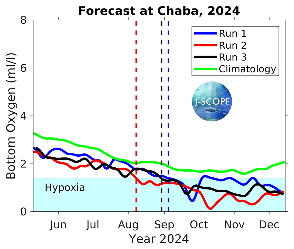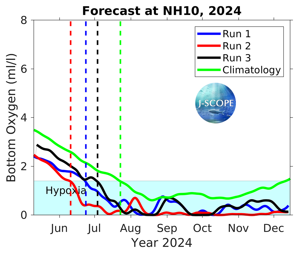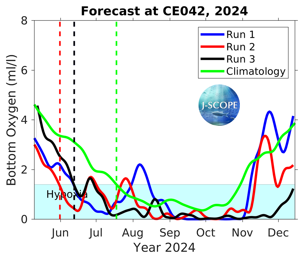 Time series of bottom oxygen from the Washington coast near one of the Olympic Coast National Marine Sanctuary (OCNMS) moorings at Cape Elizabeth (site CE042), from NH-10 mooring off of Newport, Oregon, and from the Ćháʔba· mooring off of La Push, Washington, are shown for each member of the ensemble. The model forecasts that hypoxia will most likely develop at all three moorings. At the NH-10 mooring, hypoxia is forecasted to begin in mid June/early July, which is more than one month before the climatological onset of hypoxia (green). Further north, at the CE042 mooring, hypoxia is forecasted to begin in early June to mid June, which is more than one month before the climatological onset of hypoxia (green). Another time series from the outer Washington shelf, Ćháʔba·, forecasts hypoxia onset for all three ensemble members in August is unusual for this location and there is not typically hypoxia observed at this location.