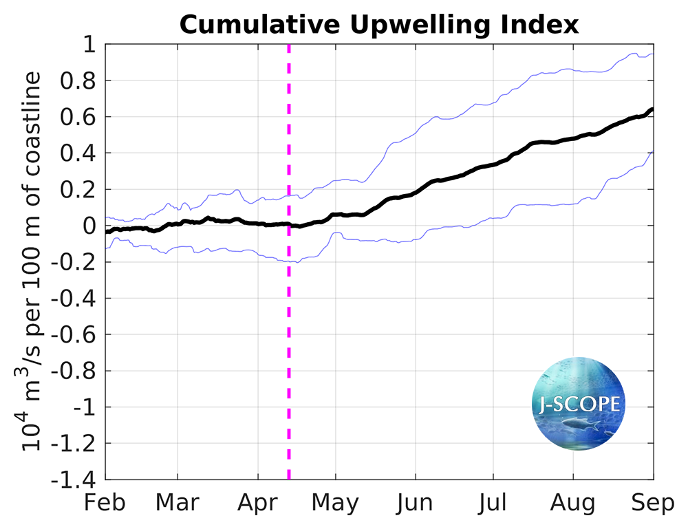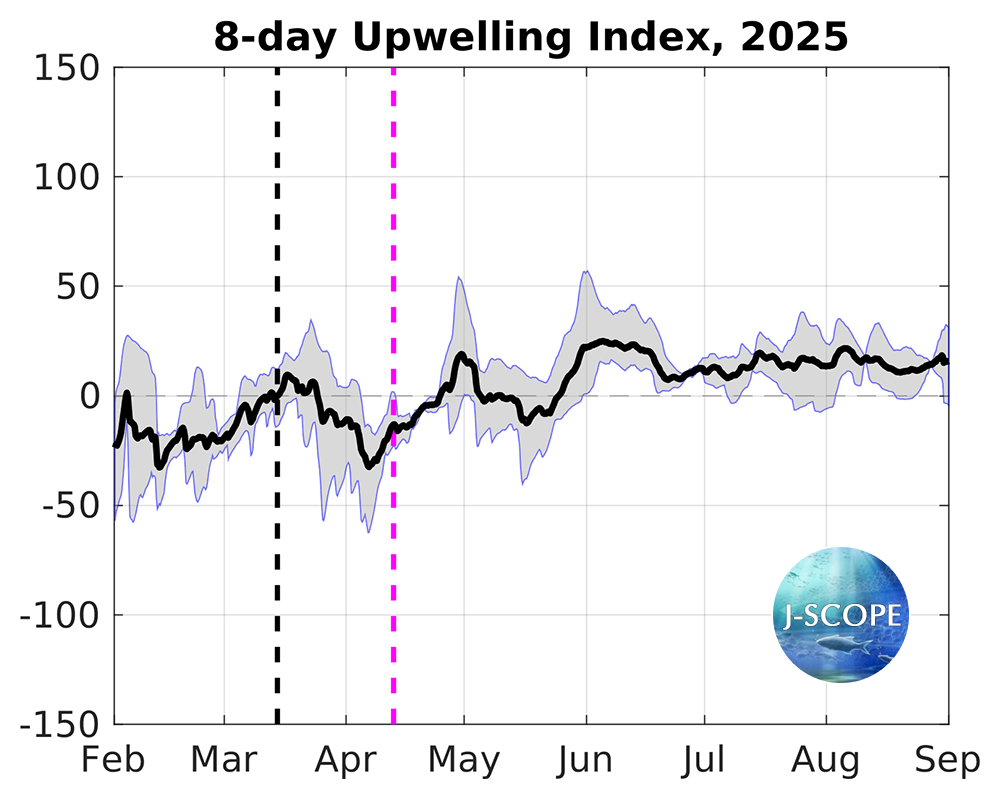 - Regional Upwelling Indices which drive local primary production: The wind product reported here is the 8-day Upwelling Index. The average of all three model runs making up the ensemble is plotted as a solid line with the range of ensemble runs shown as a gray cloud around the line. The upwelling season is forecasted to begin on the March 14th (black line), which is earlier than the climatological average of April 13th (pink line).