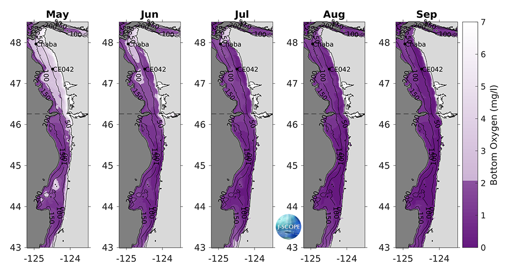 The modeled region bottom oxygen (mg/l) averaged over all three ensemble members and in time for (from left to right) May, June, July, August, and September. Hypoxia (O2 < 2 mg/l) is shown in dark purple, land is shown in light grey, and offshore areas are shaded dark gray. The black dashed line indicates the boundary between Washington and Oregon waters. Black contours indicate bathymetry on the shelf. Two mooring locations are plotted for reference (Ćháʔba·, CE042).
