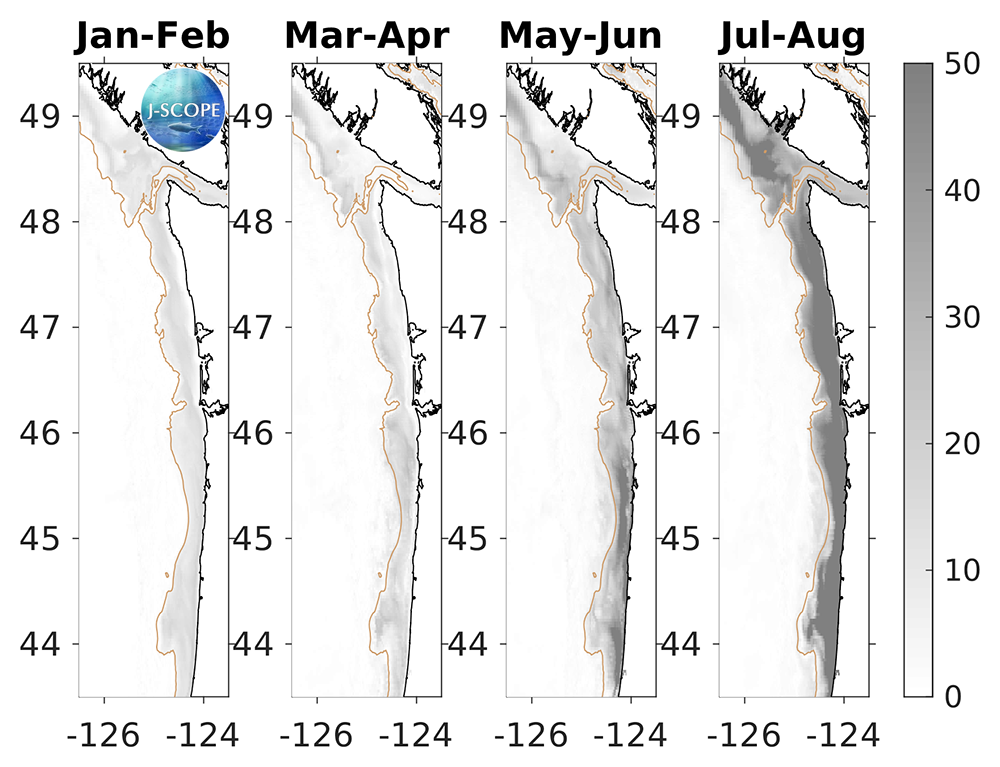 Hypoxia extends upward into the water column as well. The percentage of the water column that is forecasted to experience hypoxia (O2 < 2 mg/l) is a metric for this phenomenon. Early in the upwelling season, hypoxia is forecasted to occupy a small percentage of the water column over the entire modeled region (<10%). In July, some regions in Oregon, begin to experience more than ~20%. Over the course of the summer, the percentage of the water column that is hypoxic increases coast-wide, with particularly high volumes forecasted for Heceta Bank on the Oregon shelf and south of Cape Elizabeth in August and September with values exceeding 50% of the water column experiencing hypoxia.