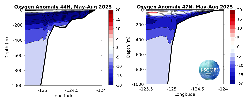 Finally, climatological cross-sections from the Newport Line in Oregon (44°N) and the Grays Harbor Line in Washington (47°N) are compared to the forecasted average of the ensemble members during the summer upwelling season (May - August). In both Oregon and Washington, the forecast projects that the oxygen concentration for the upwelling season of 2025 will be lower than the climatology on both the shelf and at deeper depths, with the largest anomalies occurring between ~100 m and ~400 m depth in Oregon, and ~50 m and 450 m depth in Washington.