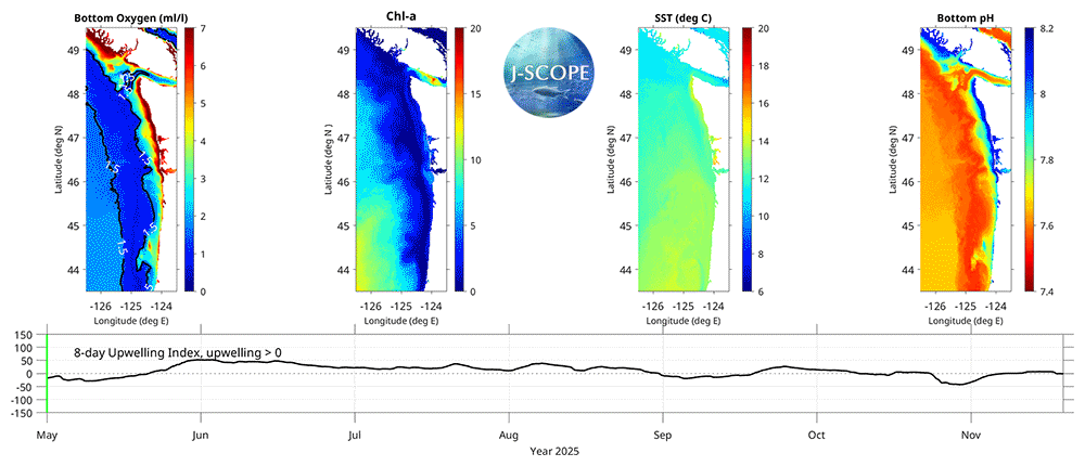 The J-SCOPE forecast system for Washington and Oregon coastal waters presents preliminary results for the 2025 upwelling season. The CFS forecast indicates ENSO-neutral conditions are favored through the Northern Hemisphere summer 2025 (74% chance during June-August), and into fall with chances exceeding 50% through August-October 2025. In comparison to the climatological data, during the summer upwelling season (May-August), coastal regions are forecasted to have near climatological sea surface temperatures (SST) throughout the upwelling season. Subsurface temperatures are forecasted to be lower over both the Washington Oregon shelves. Bottom oxygen is forecasted to be lower over both the Washington Oregon shelves with subsurface oxygen anomalies extending down the slope regions. Hypoxia is forecasted earlier than climatological (June) at both CEO42 and NH10, with one ensemble member developing hypoxia in May. Hypoxia is forecasted to develop at Ćháʔba· as well. Chlorophyll concentrations vary spatially but are forecasted to be higher on the early portion of the upwelling season and lower over latter portion. Bottom Ω is forecasted to be undersaturated throughout the upwelling season. Surface Ω is forecasted to be supersaturated throughout the upwelling season for all coastal areas.