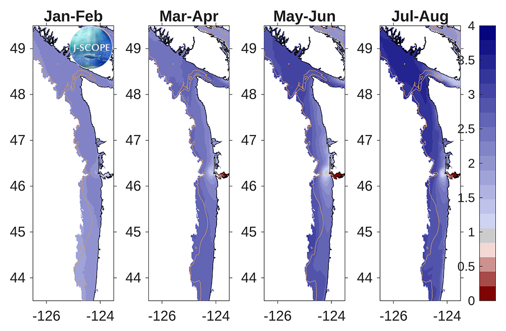 The modeled region bottom aragonite saturation state (Ω) averaged over all three ensemble members and in time for (from left to right) January - February, March - April, May - June, July - August. For reference, Ω = 1 is the physical chemistry defined boundary between undersaturated and saturated conditions, but stressful conditions for juvenile oysters begin to occur before the waters become undersaturated (Ω = 1.3). The 200m isobath is outlined by the beige contour line.
