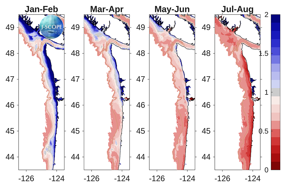 The movie above shows the J-SCOPE forecast for 2026, from ensemble model run 3 initialized on January 25. The 8-day upwelling index is calculated using the method described in Austin and Barth (2002) and can also be found under the California Current Indicators tab above.