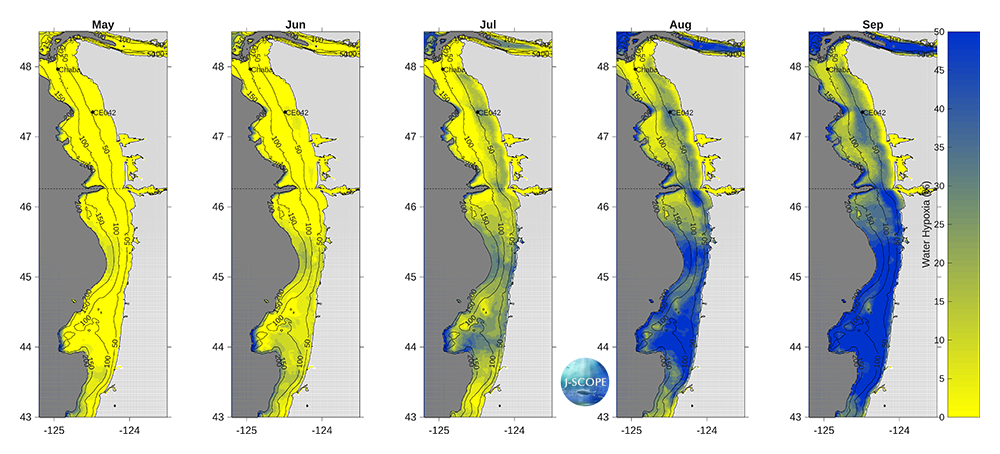 Hypoxia extends upward into the water column as well. The percentage of the water column that is forecasted to experience hypoxia (O2 < 2 mg/l) is a metric for this phenomenon. Early in the upwelling season, hypoxia is forecasted to occupy a small percentage of the water column over the entire modeled region (<10%). In July, some regions in Oregon, begin to experience more than ~20%. Over the course of the summer, the percentage of the water column that is hypoxic increases coast-wide, with particularly high volumes forecasted for Heceta Bank on the Oregon shelf in August and September with values exceeding 50% of the water column experiencing hypoxia.