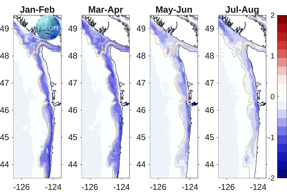 The modeled region bottom oxygen (ml/l) anomaly averaged over all three ensemble members and in time for (from left to right) January - February, March - April, May - June, July - August.