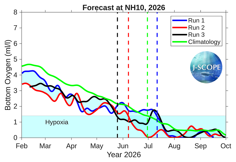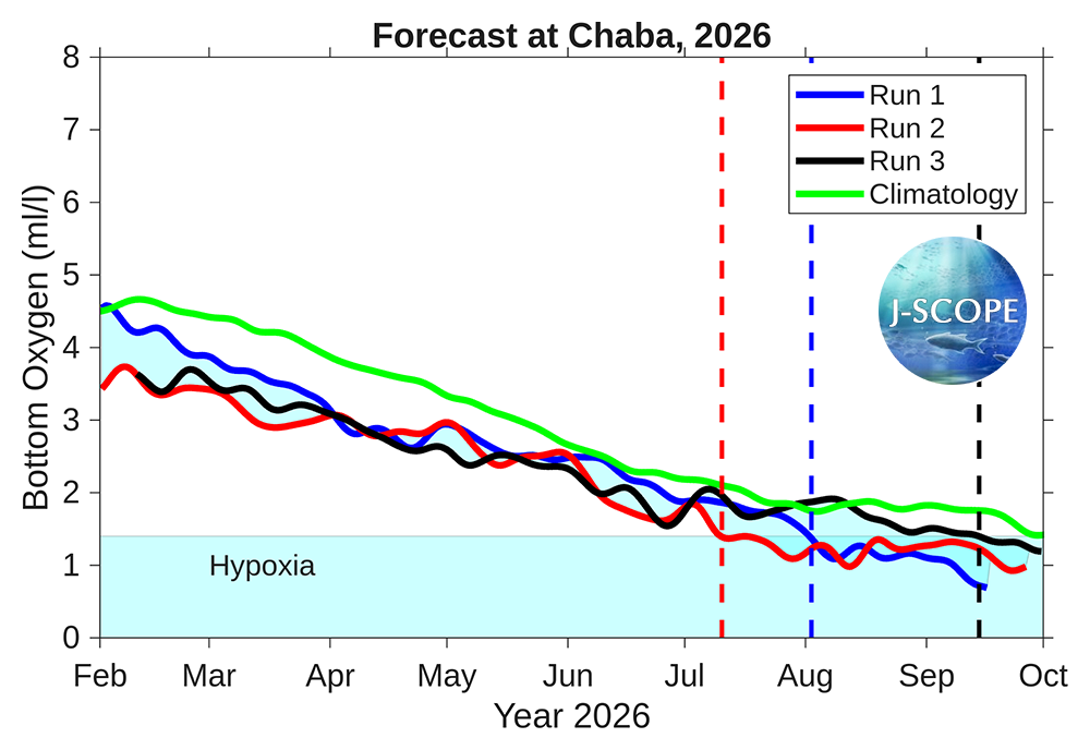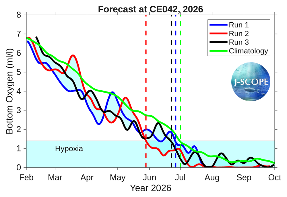Time series of bottom oxygen from the Washington coast near one of the Olympic Coast National Marine Sanctuary (OCNMS) moorings at Cape Elizabeth (site CE042), from NH-10 mooring off of Newport, Oregon, and from the Ćháʔba· mooring off of La Push, Washington, are shown for each member of the ensemble. The model forecasts that hypoxia will most likely develop at all three moorings - but more likely at the NH-10 mooring late May/early June and at the CE042 mooring in late June, which is before the climatological onset of hypoxia in both regions (green). Another time series from the outer Washington shelf, Ćháʔba·, forecasts hypoxia onset in July or August is unusual for this location and there is not typically hypoxia observed at this location.