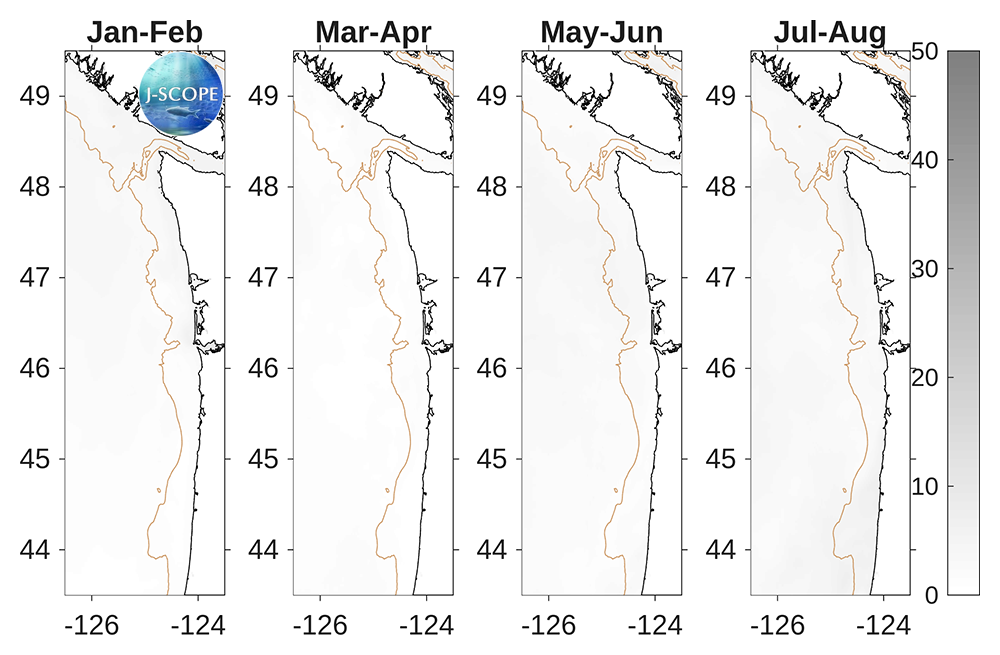 Finally, climatological cross-sections from the Newport Line in Oregon (44°N), as well as the Grays Harbor Line in Washington (47°N), are compared to the forecasted average of the ensemble members. The forecast projects that while SST is projected to be warmer than climatology, this warm anomaly extends deeper along the Grays Harbor Line (0-200m depth) than the Newport Line, and the subsurface waters are forecasted to have temperatures for the upwelling season of 2026 that are warmer than climatological in Washington and near climatological in Oregon.