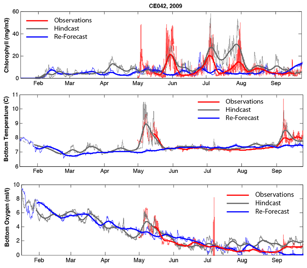 Shown below are the modeled and observed bottom temperature, bottom oxygen and surface chlorophyll plotted as time series from one of the mooring’s, sited at Cape Elizabeth, during 2009. Both the model simulations and the observations were smoothed with a moving average filter of 15 days. The hindcast does an excellent job of capturing even the event scale variability in all fields. While the re-forecast shows less skill, as expected, it predicts seasonal timescales well. The re-forecast performs better with temperature and oxygen than with surface chlorophyll; however it captures the seasonal cycle of chlorophyll – surface chlorophyll is low in the winter and increases during the upwelling season. The re-forecast model predicts lower oxygen nine months out into the future than the hindcast does. This is due to the difference in reversals and downwelling wind events in the two simulations. These results collectively provide a reasonable degree of confidence in the forecast system.