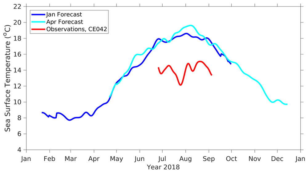Sea temperature forecasts compared to the Cape Elizabeth 42m station observations.