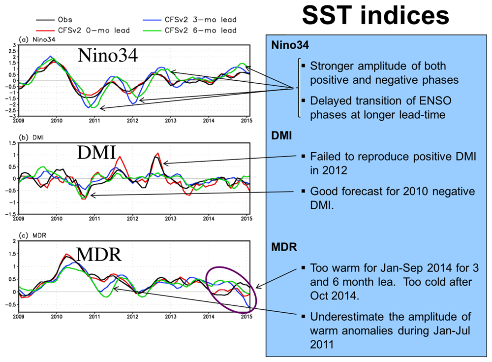 The CFS predictions from early 2014 indicated the persistence of slightly warmer than normal sea surface temperature (SST) off the coast of the Pacific Northwest until fall of 2014 when SST was forecasted to decrease. However, during the start of 2014 the actual SSTs were approximately normal but began to increase in the fall. More information can be found here.