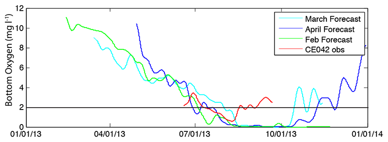 Oxygen forecasts compared to the Cape Elizabeth 42m station observations