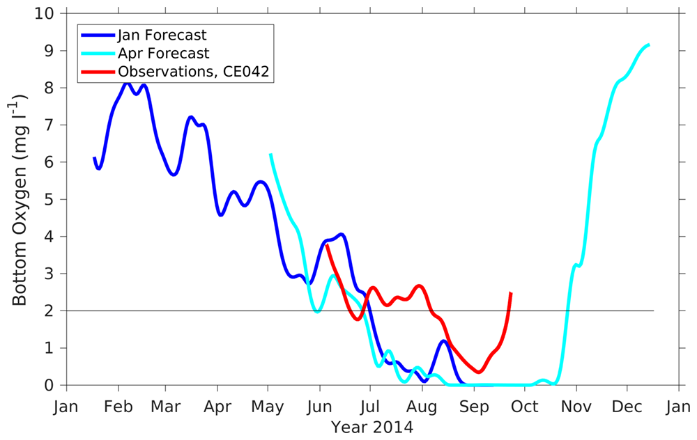 At the Cape Elizabeth OCNMS mooring in 42 meters of water (~47°N), the forecast predicted the onset of hypoxic conditions (<2 mg oxygen / L) for more than 8 consecutive days beginning on July 1 (January forecast) and June 26 (April forecast). This location observed hypoxia beginning on June 19. The forecast predicted the location would remain hypoxic and develop anoxia in late July through mid-October. The observations show that while this location remained hypoxic, the location never went anoxic.