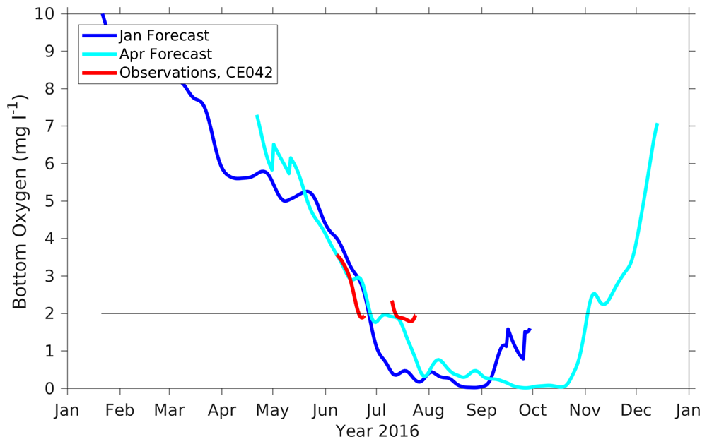 At the Cape Elizabeth OCNMS mooring in 42 meters of water (~47°N), the forecasts predicted the onset of hypoxic conditions (<2 mg oxygen / L) very closely to what was observed. The forecasts predicted hypoxia for more than 8 consecutive days beginning on Jun 27 (January and April forecasts); this location observed hypoxia beginning on June 20. The forecast predicted the location would remain hypoxic and develop anoxia in late August through mid-October.