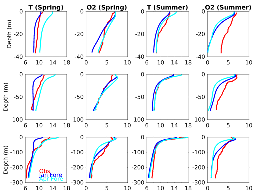 A comparison of January-initialized and April-initialized model forecasts and observations from three locations (inner, mid, and outer shelf) along the Newport Line on the Oregon shelf. The modeled fields (January forecast - teal, April forecast - darker blue) were extracted at each location and depth. The observations (red) are based on twice-monthly samples. Temperature and oxygen profiles are shown for Spring (April - June) and Summer (July - September).