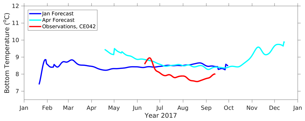 SST was biased high throughout the summer for both the January and April forecasts for 2017 compared to the observations at the OCNMS Cape Elizabeth mooring. On average, the model was ~5 deg C too warm. Forecasted bottom temperatures were also biased warm by 0.5-1 deg C at the same mooring.