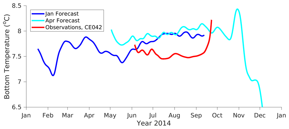 SST was biased high throughout the summer for the 2014 January forecast compared to the observations at the OCNMS Cape Elizabeth mooring; in August the forecast was approximately 7 degrees too warm. The April forecast was ~4 degrees cooler than the observations in July but warmer than the observations by ~2-3 degrees during July - September. The late upwelling season is when the forecast performed the worst, as previously discussed, due to the biases in the winds and radiation from CFS. Forecasted bottom temperatures were also biased warm by 0.5-0.75 deg C at the same mooring.