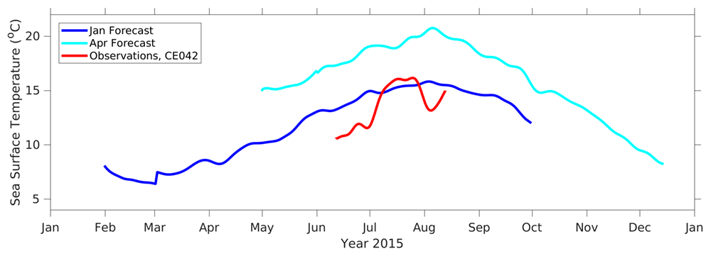 SST was biased high throughout the summer for the 2015 April forecast compared to the observations at the OCNMS Cape Elizabeth mooring; in August the forecast was approximately 8 deg C too warm. The January forecast was ~2-3 deg C warmer than the observations in July and August, but forecasted the SST very well in July. Forecasted bottom temperatures were also biased warm by 1-2 deg C at the same mooring.